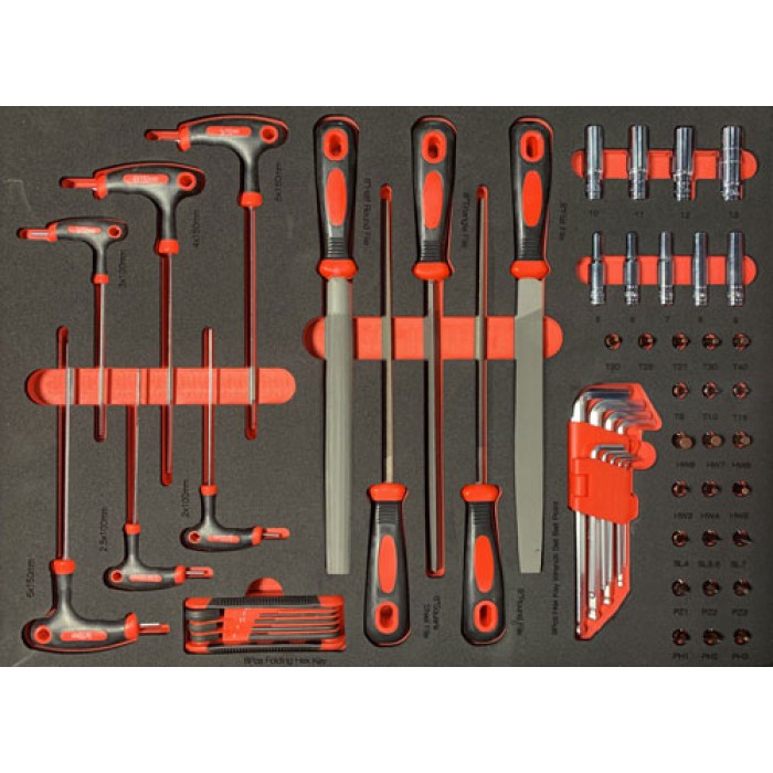 Набір інструменту ShiningBerg у ложементі 60 од. Інструменти для виконання слюсарних робіт різного характеру. Даний набір стане відмінним доповненням інструментального візка в гаражі або на станції техобслуговування. У набір входять професійні напильники по металу з довжиною 8". Комплект шестигранників з Т-подібною ручкою. Набір поставляється в ложементі з інноваційного матеріалу, який має високу стійкість до деформації і маслостійкість.