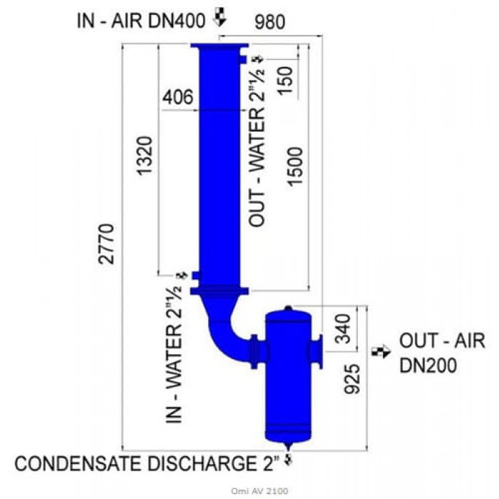 Доохладитель сжатого воздуха Omi AV 2100 используется для предварительного охлаждения подаваемого компрессором сжатого воздуха высокой температуры. Эксплуатируется в пневмосистемах как самостоятельно, так и в составе с осушителями, так как последние не допускают эксплуатацию при горячем входящем воздухе, за исключением специальных моделей. Можно даже сказать, что оконечные охладители воздуха, в некотором роде, также являются осушителями воздуха, с более высокой температурой точки росы. Влага, содержащаяся в сжатом воздухе, удаляется в циклонном сепараторе, на выходе из охладителя AV 2100.