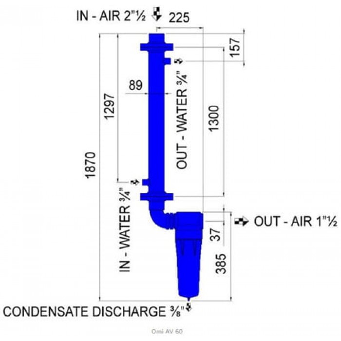 Доохладитель сжатого воздуха Omi AV 60 используется для предварительного охлаждения подаваемого компрессором сжатого воздуха высокой температуры. Эксплуатируется в пневмосистемах как самостоятельно, так и в составе с осушителями, так как последние не допускают эксплуатацию при горячем входящем воздухе, за исключением специальных моделей. Можно даже сказать, что оконечные охладители воздуха, в некотором роде, также являются осушителями воздуха, с более высокой температурой точки росы. Влага, содержащаяся в сжатом воздухе, удаляется в циклонном сепараторе, на выходе из охладителя AV 60.