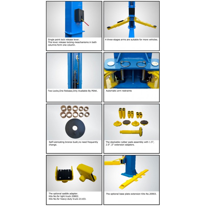 Данная модель автоподъемника оборудована возможностью регулирования по ширине (2 позиции), регулирования по обслуживаемой длине оси транспортного средства (короткой и длинной), что обеспечивает комфортные условия работы с автомобилями. Вместе с тем подъемник долговечен и надежен в эксплуатации, менее требователен в обслуживании. Считается универсальным, высокотехнологичным автомобильным двухстоечным подъемником, произведенным в соответствии с высокими стандартами качества и безопасности эксплуатации компании PEAK.