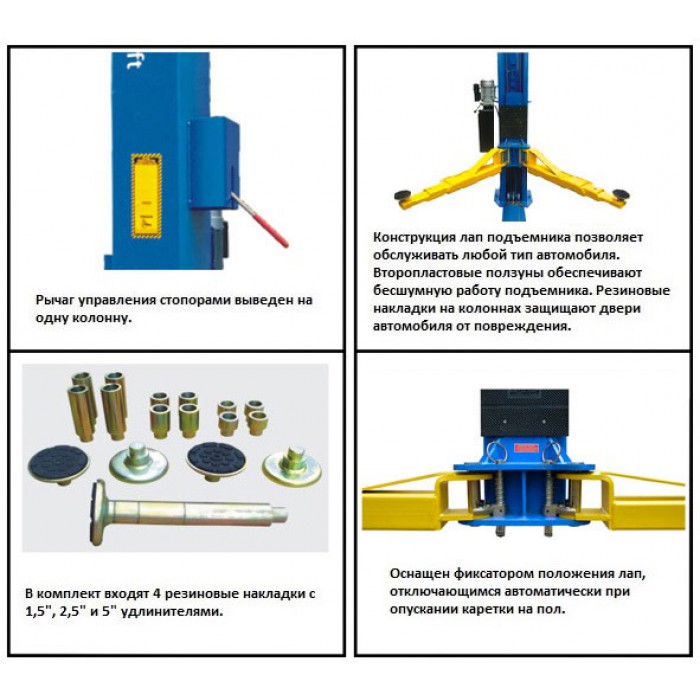 - Автоматическая система блокировки подъемных кареток с механической разблокировкой одним рычагом на главной колонне.
