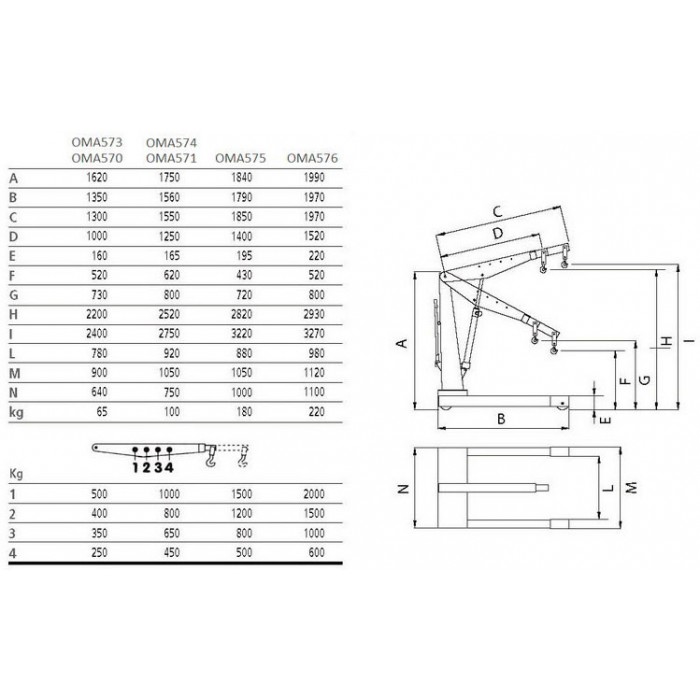 Кран гидравлический Oma 570 — это не складной кран для поднятия и опускания габаритных предметов массой до 500 кг на высоту до 240 см. Как правило, не складные краны реже применяются в автосервисах из-за не складной конструкции, которая не позволяет экономить рабочее пространство при хранении. В отличии от складных моделей, не складные имеют параллельные друг к другу лапы и имеют большую устойчивость при перемещении. Кран грузоподъемностью на 500 кг при минимальном вылете стрелы, грузоподъемность при максимальном вылете стрелы 250 кг.
