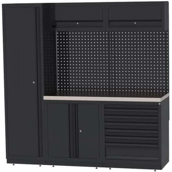 Iron Pack 001, 1960 мм - это продуманный и функциональный комплект мебели для сервиса, мастерской или гаража. Он объединяет в себе всё необходимое для удобного хранения инструментов и комфортной работы.
