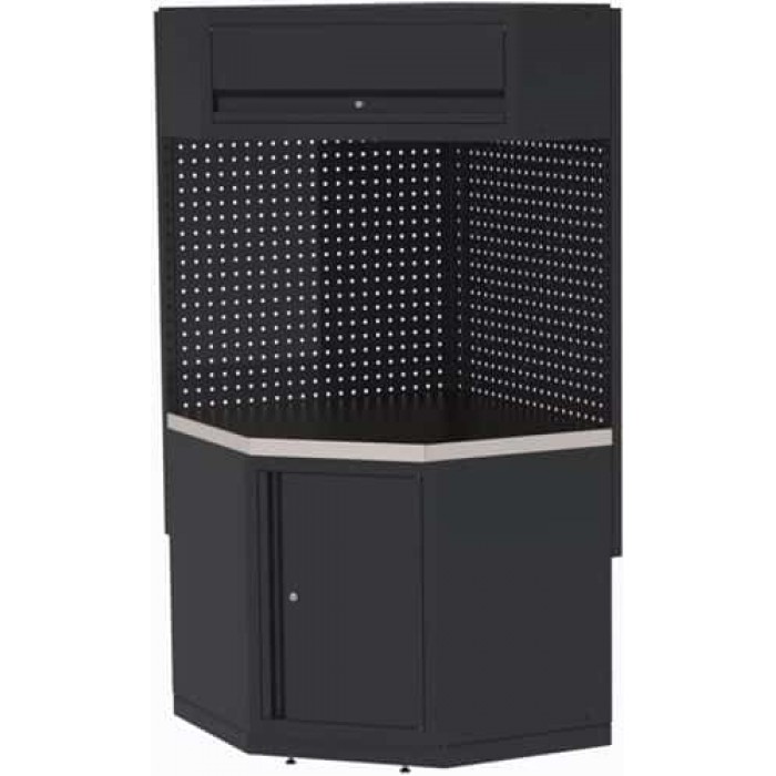 Модуль ПМ-011 (угловой) - идеальное решение для рационального использования рабочего пространства. Конструкция позволяет устанавливать его в углу, создавая удобное продолжение рабочей зоны. Модуль оснащён нижним шкафом с дверцей, верхним навесным шкафом и перфорированными панелями для хранения инструмента.