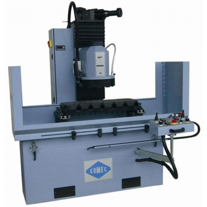 RP 1000 это станок для шлифования головок цилиндров и блоков легковых и грузовых авто, а также плоских поверхностей, нуждающихся в точном шлифовании. Максимальная длина деталей 980 мм, ширина 320 мм, высота 450 мм. Все компоненты станка - основание, стол, колонна и головка изготовлены из чугуна высокого качества, что обеспечивает станку выносливость и жесткость. Подача стола выполняется при помощи привода с шариковым винтом при высокой точности даже на маленьких скоростях, преобразователь частоты, управляющий редуктором привода позволяет менять скорость вращения при помощи потенциометра. Другой преобразователь отвечает за скорость вращения шпинделя для достижения оптимальной скорости для резки в любой момент в соответствии с разными техниками резки камня, чугуна или алюминия предпусковой камеры сгорания головки цилиндров, инструмент для алюминия или опциональные приспособления, как 8 пластинок для резки или держатель резцов CBN-PCD. Расположенный в удобном месте датчик показывает частоту вращения. В целях безопасности и удобства станка все элементы управления расположены на адаптивной панели управления, кроме того, чтобы продукт был оборудован полностью, в стандартную комплектацию входит устройство для быстрой подачи головки, эффективная система охлаждения с бачком, а также приспособления для шлифовки алмазным инструментом. Как опция доступен крепеж для фиксации головок цилиндров, набор для установки V-образных блоков, вращающийся стол для шлифования маховиков, дисков сцепления или тормозных дисков.