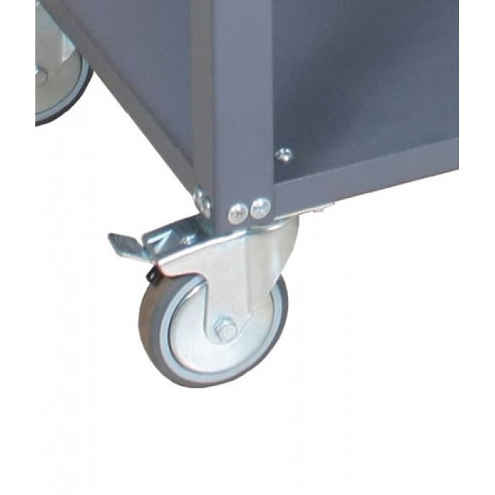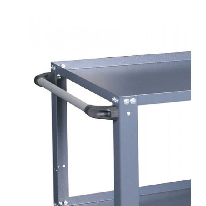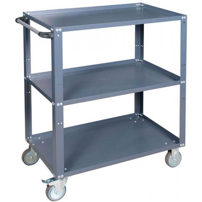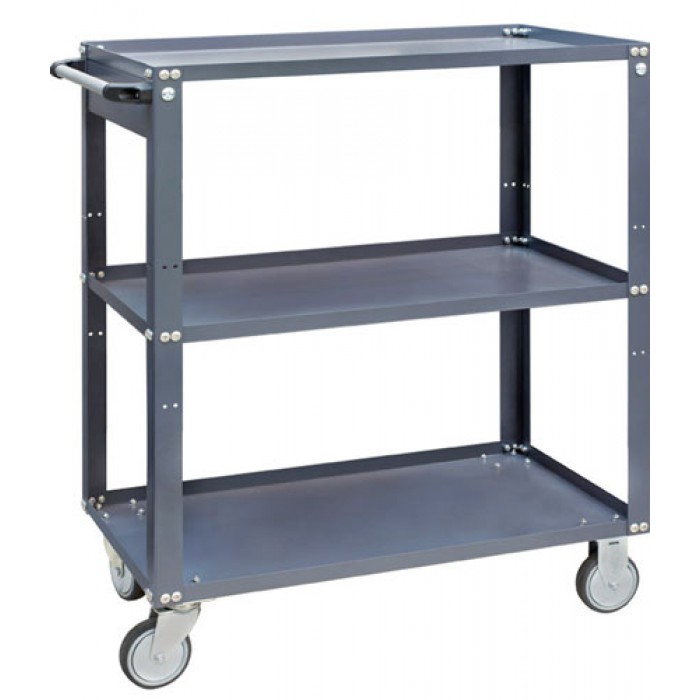 Для хранения груза используются три полки. Они оборудованы выступающим кантом, предотвращающим разливание жидкостей и падение предметов. Средняя полка регулируется в трех положениях, размещая груз даже нестандартных габаритов. На поверхностях не образуются царапины и сколы при длительной эксплуатации, цвет не выгорает под действием освещения. В основании конструкции четыре колеса диаметром 100 мм: два поворотных и два неповоротных, одно колесо оборудовано тормозом. Это обеспечивает контроль транспортировки тележки в любом направлении и маневренность между стеллажами. Повысить удобство эксплуатации помогает выступающая ручка.