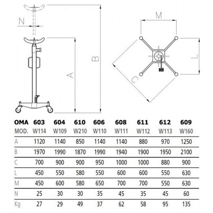 Мобильная трансмиссионная стойка OMA 603 одноступенчатого типа с телескопическим штоком. Применяется для подъема и перемещения грузов при обслуживании транспортных средств. В конструкцию стойки входят насос и гидроцилиндр. Для маневренности и легкости перемещения оборудование оснащено полноповоротными вращающимися колесами. Ножной привод позволяет мастеру производить манипуляции двумя руками и при этом выполнять накачку ногой. Стойки от Итальянского производителя OMA-Werther чрезвычайно износостойкие и долговечные устройства, упрощающие рабочий процесс автомастеров. Подъем осуществляется с помощью насоса, приводимого в действие педалью, что обеспечивает удобства направления и центрирования агрегатов, спуск - с помощью специального рычага. По желанию потребителя устройство может быть укомплектовано различными сменными захватами для снятия того или иного агрегата или узла автомобиля.