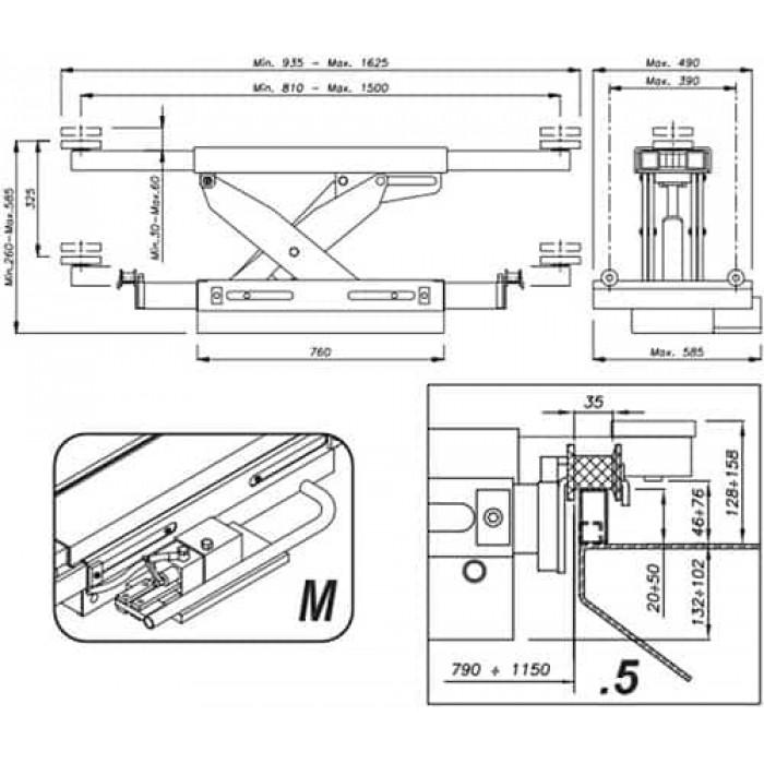 Все домкраты снабжены защитной шторкой для предотвращения попадания инструмента или рук механика в механизм домкрата. Данные домкраты предназначены для вывешивания осей автомобиля при регулировке углов установки колес. У всех домкратов выдвигаются по длине лапы и регулируется расстояние между роликами. Комплект упоров с резиновыми прокладками. В гидросистему встроен клапан для предотвращения перегрузки и клапан, предотвращающий несанкционированное опускание автомобиля в случае обрыва гидропривода.