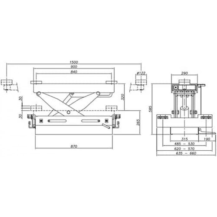 Ножничная гидравлическая траверса OMA 544A.06 с пневмоприводом насоса. Грузоподъемность 6000 кг.
