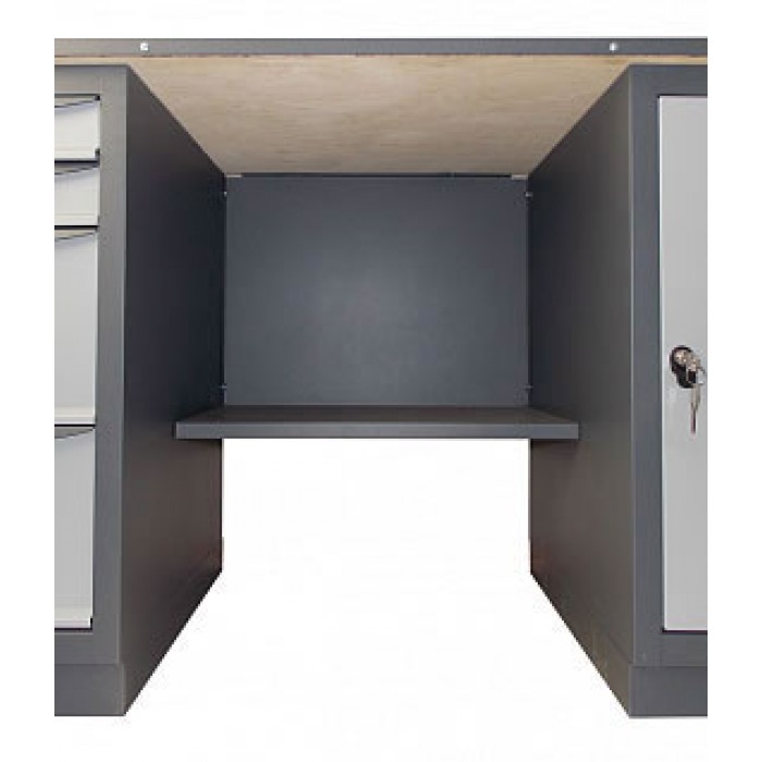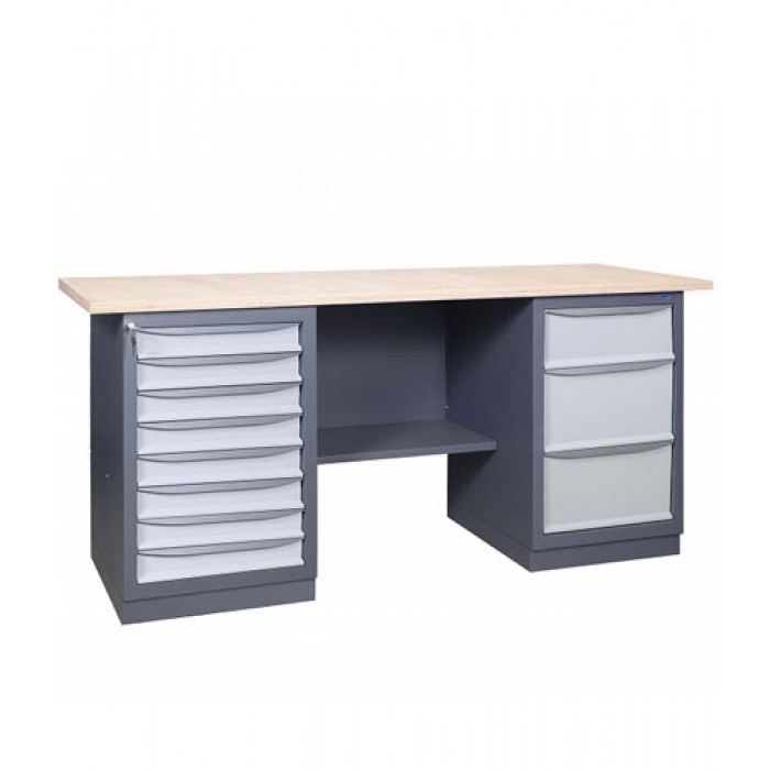 Металлический слесарный Верстак 41 8М/С2Б предназначен для оборудования рабочих мест на промышленных предприятиях, в мастерских и автосервисах. Верстаки изготавливаются из высококачественной листовой стали. Верстаки двухтумбовые могут укомплектовываться перфорированными панелями, навесными полками, лампами дневного свечения, блоком розеток, держателями для инструмента и крючками. Верстаки с двумя тумбами могут поставляться в разобранном виде. Тумбы верстаков могут укомплектовываться различным количеством ящиков трех типоразмеров или дверью. Характерные черты: крепкая, прочная конструкция, современный дизайн, не уступающий европейским производителям. Полимерно-порошковая покраска с предварительным фосфатированием. Столешница – влагоустойчивая фанера, с различными видами покритий и чехлов. Комплектуются тумбами с ящиками 3-х типоразмеров. Ящики на телескопичных направляющих. Ящики выдвигаются на 100% - нагрузка на ящик 40 кг. Центральный замок на ящики тумбы, индивидуальный замок на дверцу. Комплектация верстака: Тумба с восемью ящиками / Тумба с тремя ящиками. Ящики на телескопических направляющих, выдвижение на 100%.