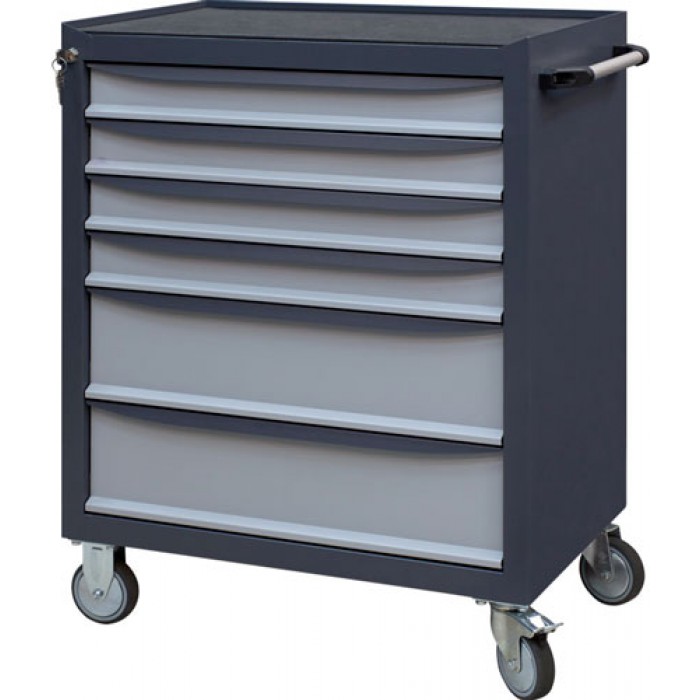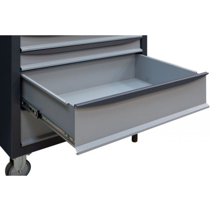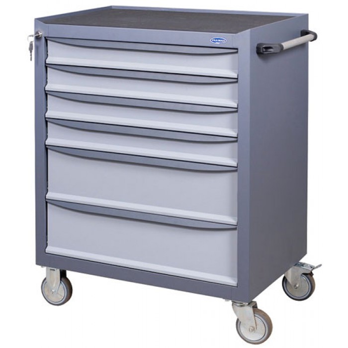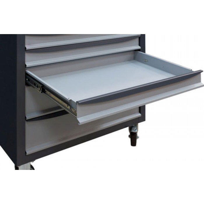 Під час роботи майстру потрібна мобільність. Візок зручно розмістити поруч із місцем співробітника для швидкого доступу до інструменту. Корпус складається із металевих листів, пофарбованих полімерно-порошковою фарбою. Покриття підвищує стійкість металу до температурних впливів та атмосферних перепадів, запобігаючи появі іржі. Вага візка 50 кг, у нижній частині закріплені чотири колеса. Вони мають діаметр 100 мм (одне обладнане стопором) для пересування в будь-якому напрямку. Наявність шести ящиків вирішує проблему нестачі місця. Вони оснащені телескопічними направляючими для повного відкриття. Ящики закриваються єдиним замком, тому сторонні не зможуть взяти вміст.