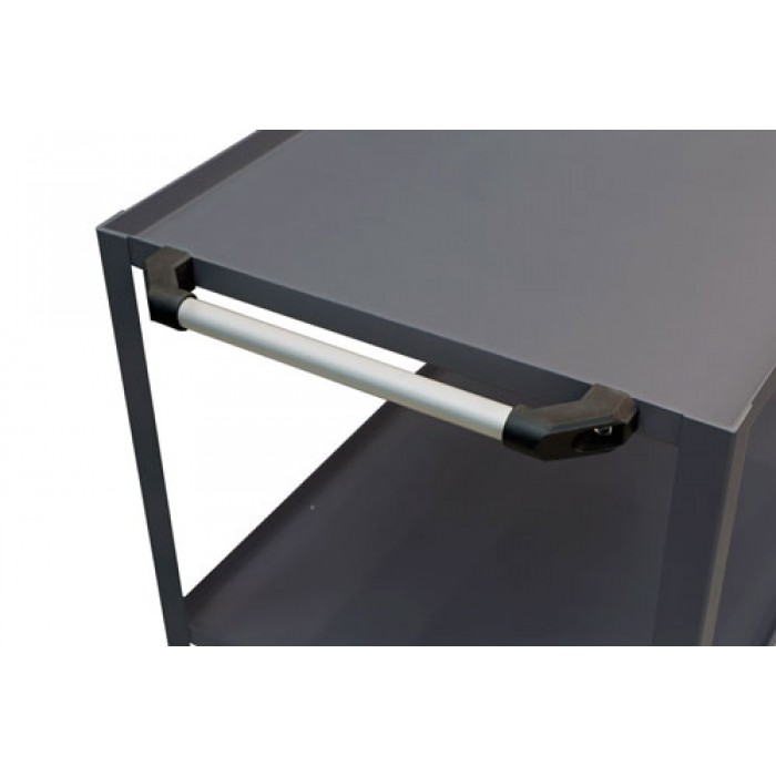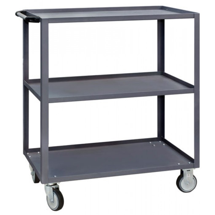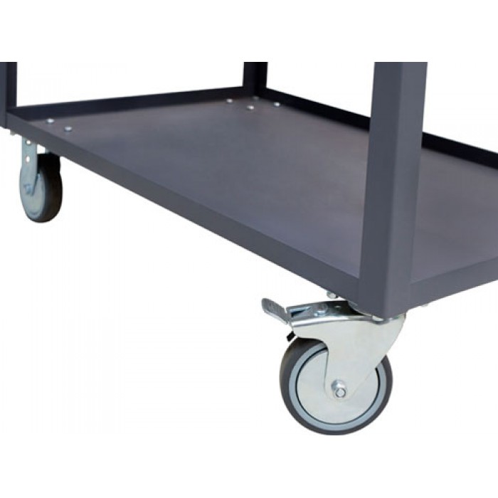 Зварна металева конструкція стійка до розхитування та деформації. Візок обладнаний трьома полицями з виступаючим кантом, що не дасть метизам загубитися в перевезенні, а рідинам – пролитися на підлогу. Вантажопідйомність полиць складає 60 кг, що є оптимальним для габаритного вантажу, який непросто транспортувати. Візок має висоту 900 мм і ширину 750 мм, він не займає багато місця, тому підходить навіть у невелику майстерню. Чотири колеса діаметром 100 мм (на одному присутнє гальмо) легко направляють візок по бетону, каменю та навіть землі без зайвих фізичних зусиль.