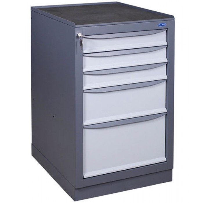 Тумба інструментальна 3МСБ комплектується 5 ящиками. Вони мають різні розміри, тому оптимальні як у зберіганні дрібних деталей, металовиробів, болтів, так і викруток, молотків і дрилів. Ящики відкриваються в повний розмір завдяки вигнутим ручкам та телескопічним направляючим. Витримують навантаження до 30 кг, що вище за характеристики більшості конкурентів. Для збереження вмісту та обмеження доступу передбачено центральний замок Euro-Locks, що замикає інструменти на ключ. Збірка тумби не складає труднощів, виріб надійний до розхитування. Колір корпусу - темно-сірий. Колір фасаду - сірий.
