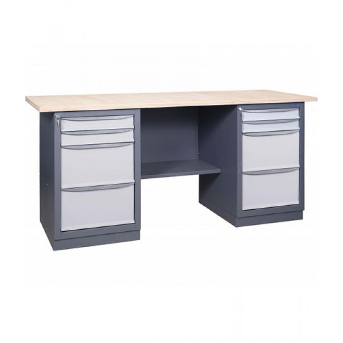 Металевий слюсарний Верстак 41 2М2Б/2М2Б призначений для обладнання робочих місць на промислових підприємствах, майстернях та автосервісах. Верстаки виготовляються з високоякісної листової сталі. Верстаки з двома тумбами можуть обладнатися перфорованими панелями, підвісними полицями, лампами денного світіння, блоком розеток, тримачами для інструментів та гачками. Верстаки двотумбові можуть поставлятися у розібраному вигляді. Тумби верстаків можуть укомплектовуватись різною кількістю ящиків трьох типорозмірів або дверима. Характерні риси: міцна конструкція, сучасний дизайн, що не поступається європейським виробникам. Полімерно-порошкове фарбування з попереднім фосфатуванням. Стільниця - вологостійка фанера, з різними видами покриттів та чохлів. Комплектуються тумбами із ящиками 3-х типорозмірів. Скриньки на телескопічних направляючих. Ящики висуваються на 100% – навантаження на ящик 40 кг. Центральний замок на ящики тумби, індивідуальний замок на дверцятах. Комплектація верстака: Тумба із чотирма ящиками / Тумба із чотирма ящиками. Скриньки на телескопічних направляючих, висування на 100%.