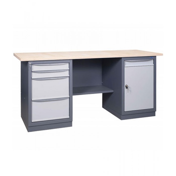 Металевий слюсарний Верстак 41 2М2Б/МД призначений для оснащення робочих місць на промислових підприємствах, майстернях та автосервісах. Верстаки виготовляються з високоякісної листової сталі. Верстаки з двома тумбами можуть обладнуватися перфорованими панелями, навісними полицями, лампами денного світіння, блоком розеток, тримачами для інструментів та гачками. Верстаки з двома тумбами можуть поставлятися у розібраному вигляді. Тумби верстаків можуть укомплектовуватись різною кількістю ящиків трьох типорозмірів або дверима. Характерні риси: міцна конструкція, сучасний дизайн, що не поступається європейським виробникам. Полімерно-порошкове фарбування із попереднім фосфатуванням. Стільниця - вологостійка фанера, з різними видами покриттів та чохлів. Комплектуються тумбами із ящиками 3-х типорозмірів. Скриньки на телескопічних направляючих. Ящики висуваються на 100% – навантаження на ящик 40 кг. Центральний замок на ящики тумби, індивідуальний замок на дверцятах. Комплектація верстака: Тумба з чотирма ящиками / Тумба з дверцятами та ящиком. Усередині тумби – знімна полиця.