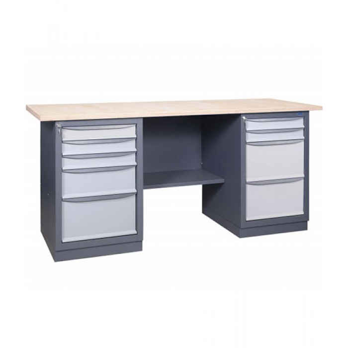 Металевий слюсарний Верстак 41 3МСБ/2М2Б з двома тумбами призначений для оснащення робочих місць на промислових підприємствах, майстернях та автосервісах. Верстаки виготовляються із високоякісної листової сталі. Верстаки двотумбові можуть укомплектовуватися перфорованими панелями, навісними полицями, лампами денного світіння, блоком розеток, тримачами для інструментів та гачками. Верстаки з двома тумбами можуть поставлятися у розібраному вигляді. Тумби верстаків можуть укомплектовуватись різною кількістю ящиків трьох типорозмірів або дверима. Характерні риси: міцна конструкція, сучасний дизайн, що не поступається європейським виробникам. Полімерно-порошкове фарбування із попереднім фосфатуванням. Стільниця - вологостійка фанера, з різними видами покриттів та чохлів. Комплектуються тумбами із ящиками 3-х типорозмірів. Скриньки на телескопічних направляючих. Ящики висуваються на 100% – навантаження на ящик 40 кг. Центральний замок на ящики тумби, індивідуальний замок на дверцятах. Комплектація верстака: Тумба із п'ятьма ящиками / Тумба із чотирма ящиками. Скриньки на телескопічних направляючих, висування на 100%.