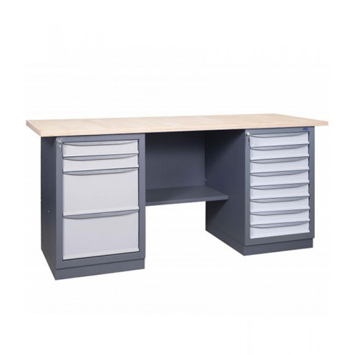 Металевий слюсарний Верстак 41 8М/2М2Б призначений для обладнання робочих місць на промислових підприємствах, майстернях та автосервісах. Верстаки виготовляються з високоякісної листової сталі. Верстаки двотумбові можуть укомплектовуватися перфорованими панелями, навісними полицями, лампами денного освітлення, блоком розеток, тримачами для інструментів та гачками. Верстаки двотумбові можуть поставлятися у розібраному вигляді. Тумби верстатів можуть укомплектовуватись різною кількістю ящиків трьох типорозмірів або дверима. Характерні риси: міцна, надійна конструкція, сучасний дизайн, що не поступається європейським виробникам. Полімерно-порошкове фарбування з попереднім фосфатуванням. Стільниця - вологостійка фанера, з різними видами покриттів та чохлів. Комплектуються тумбами із ящиками 3-х типорозмірів. Скриньки на телескопічних направляючих. Ящики висуваються на 100% – навантаження на ящик 40 кг. Центральний замок на ящики тумби, індивідуальний замок на дверцятах. Комплектація верстака: Тумба із чотирма ящиками / Тумба із вісьма ящиками. Скриньки на телескопічних направляючих, висування на 100%.