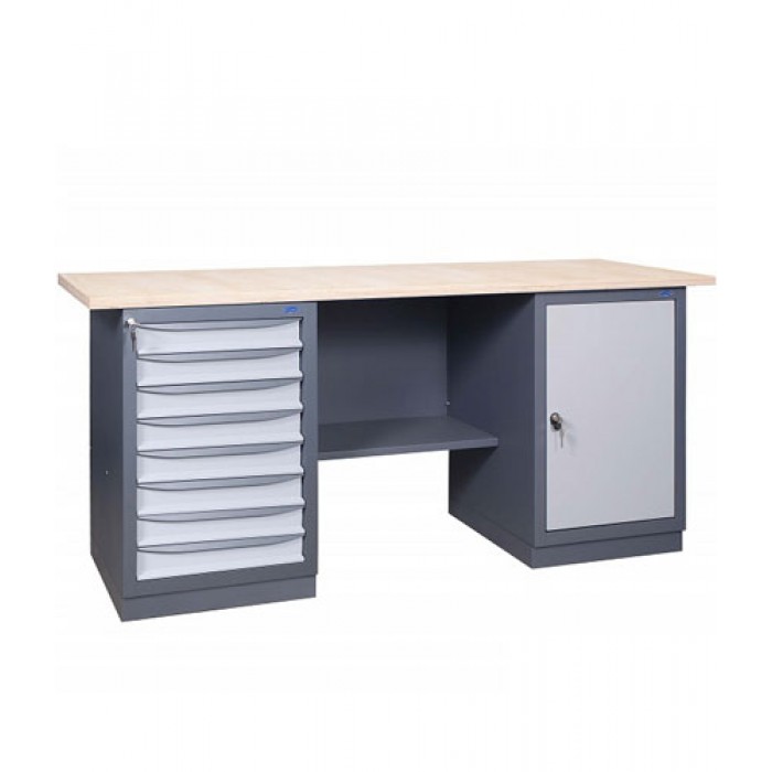 Металевий слюсарний Верстак 41 8М/Д призначений для обладнання робочих місць на промислових підприємствах, майстернях та автосервісах. Верстаки виготовляються з високоякісної листової сталі. Верстаки двотумбові можуть укомплектовуватися перфорованими панелями, навісними полицями, лампами денного освітлення, блоком розеток, тримачами для інструментів та гачками. Верстаки двотумбові можуть поставлятися у розібраному вигляді. Тумби верстаків можуть укомплектовуватись різною кількістю ящиків трьох типорозмірів або дверима. Характерні риси: міцна, надійна конструкція, сучасний дизайн, що не поступається європейським виробникам. Полімерно-порошкове фарбування із попереднім фосфатуванням. Стільниця - вологостійка фанера, з різними видами покриттів та чохлів. Комплектуються тумбами із ящиками 3-х типорозмірів. Скриньки на телескопічних направляючих. Ящики висуваються на 100% – навантаження на ящик 40 кг. Центральний замок на ящики тумби, індивідуальний замок на дверцятах. Комплектація верстака: Тумба із вісьма ящиками / Тумба із дверцятами. Усередині тумби – знімна полиця.