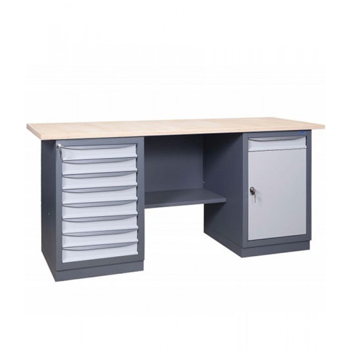 Металевий слюсарний Верстак 41 8М/МД призначений для обладнання робочих місць на промислових підприємствах, майстернях та автосервісах. Верстаки виготовляються з високоякісної листової сталі. Верстаки з двома тумбами можуть обладнатися перфорованими панелями, навісними полицями, лампами денного освітлення, блоком розеток, тримачами для інструментів та гачками. Верстаки двотумбові можуть поставлятися у розібраному вигляді. Тумби верстаків можуть укомплектовуватись різною кількістю ящиків трьох типорозмірів або дверима. Характерні риси: міцна, надійна конструкція, сучасний дизайн, що не поступається європейським виробникам. Полімерно-порошкове фарбування із попереднім фосфатуванням. Стільниця – вологостійка фанера, з різними видами покриттів та чохлів. Комплектуються тумбами із ящиками 3-х типорозмірів. Скриньки на телескопічних направляючих. Ящики висуваються на 100% – навантаження на ящик 40 кг. Центральний замок на ящики тумби, індивідуальний замок на дверцятах. Комплектація верстака: Тумба з вісьма ящиками / Тумба з дверцятами та ящиком.
