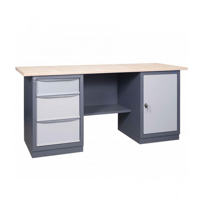Металевий слюсарний Верстак 41 С2Б/Д призначений для обладнання робочих місць на промислових підприємствах, майстернях та автосервісах. Верстаки виготовляються із високоякісної листової сталі. Верстаки двотумбові можуть укомплектовуватися перфорованими панелями, навісними полицями, лампами денного освітлення, блоком розеток, тримачами для інструментів та гачками. Верстаки з двома тумбами можуть поставлятися у розібраному вигляді. Тумби верстаків можуть укомплектовуватись різною кількістю ящиків трьох типорозмірів або дверима. Особливості: міцна, надійна конструкція, сучасний дизайн, що не поступається європейським виробникам. Полімерно-порошкове фарбування із попереднім фосфатуванням. Стільниця – вологостійка фанера, з різними видами покриттів та чохлів. Комплектуються тумбами із ящиками 3-х типорозмірів. Скриньки на телескопічних направляючих. Ящики висуваються на 100% – навантаження на ящик 40 кг. Центральний замок на ящики тумби, індивідуальний замок на дверцятах. Комплектація верстака: Тумба з трьома ящиками / Тумба з дверцятами.