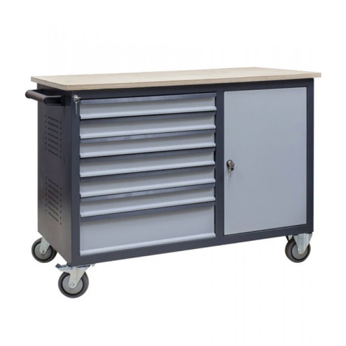 Мобільний верстак ефективний у будь-якій сфері промисловості. Міцне складання запобігає розхитування та витримує щоденну експлуатацію. Верстаку не знадобиться ремонт навіть після кількох років, йому не потрібен специфічний догляд. Металевий каркас оснащений шістьма компактними та одним великим ящиком. Вони висуваються на телескопічні напрямні, забезпечуючи 100% доступ. Для габаритних деталей передбачена тумба з дверцятами. Обидва блоки сховищ закриваються замками з поворотним ключем, тому вміст залишиться в безпеці.